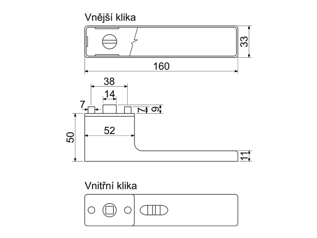 Funkce zamykání: vnitřní klika s páčkou pro zamykání - vnější klika s nouzovým otevřením (mincí/šroubovákem)